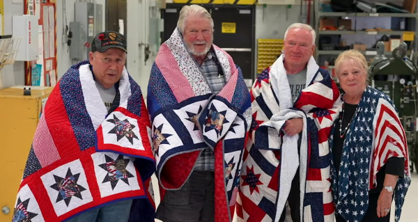 Jacquie Schroader presenting a Quilt of Valor to Pam Barrows who was a nurse in Vietnam.